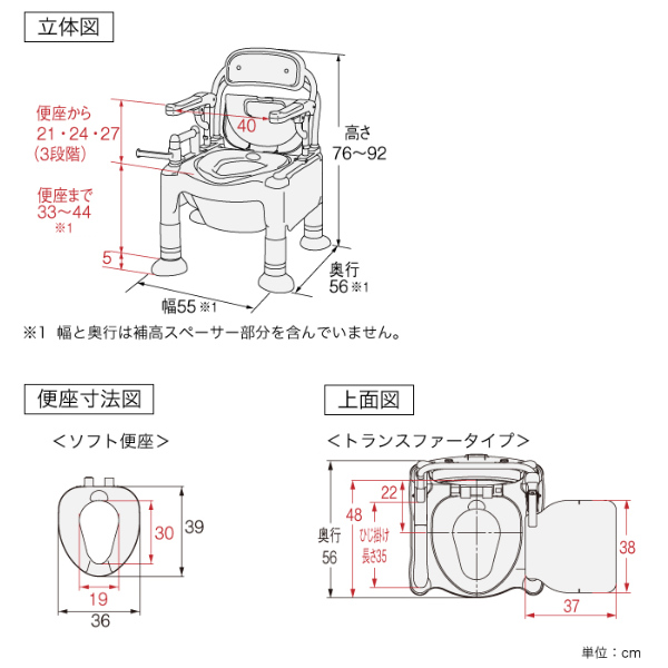 | サイズ | 約 幅55×奥行56×高さ76〜92(cm) (便座までの高さ:33〜49cm) トランスファーボード寸法:38×37cm |