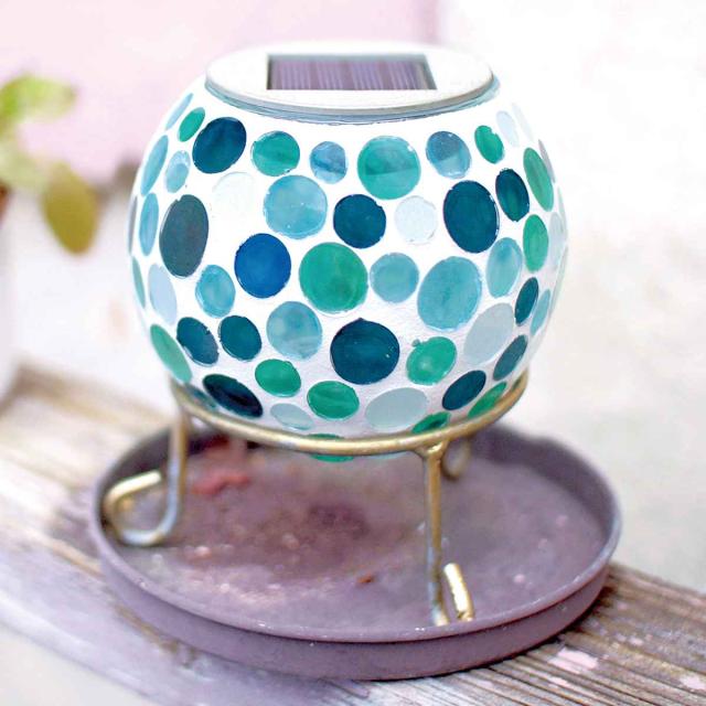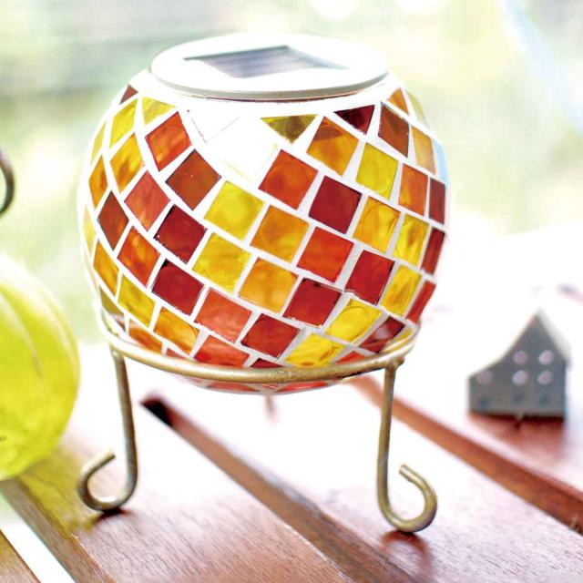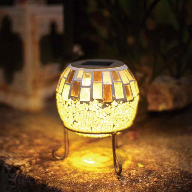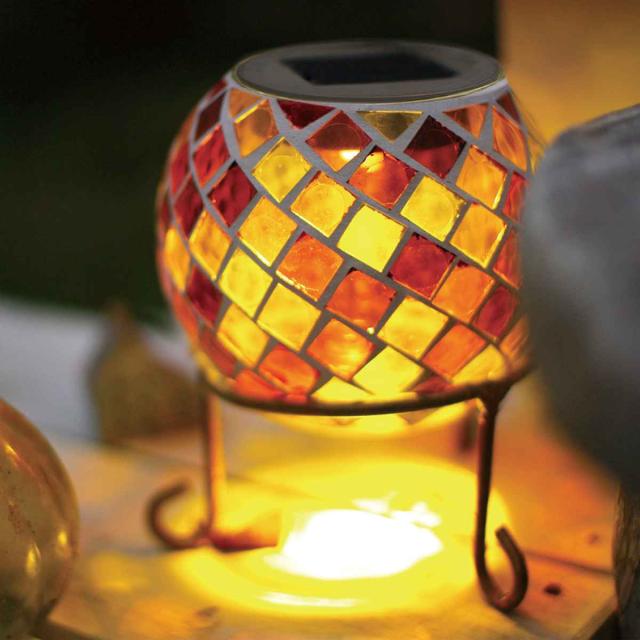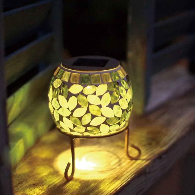 暗くなると自動で点灯し、色とりどりの個性豊かな模様のモザイクガラスからキラキラ光りが溢れます。