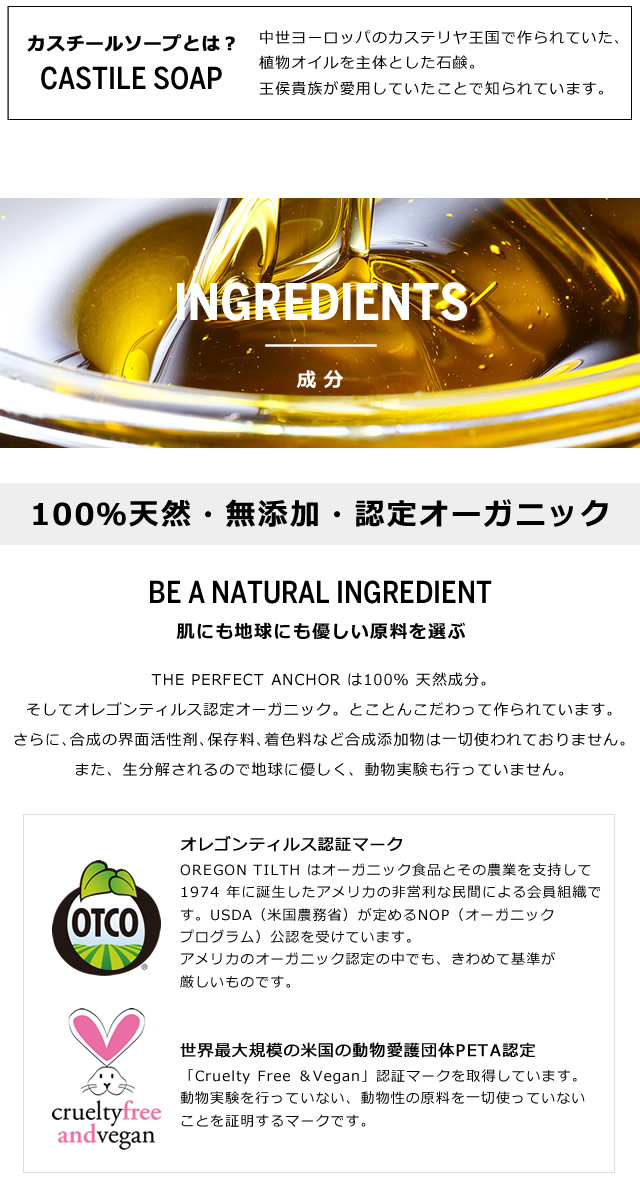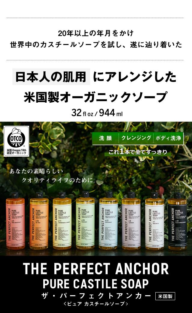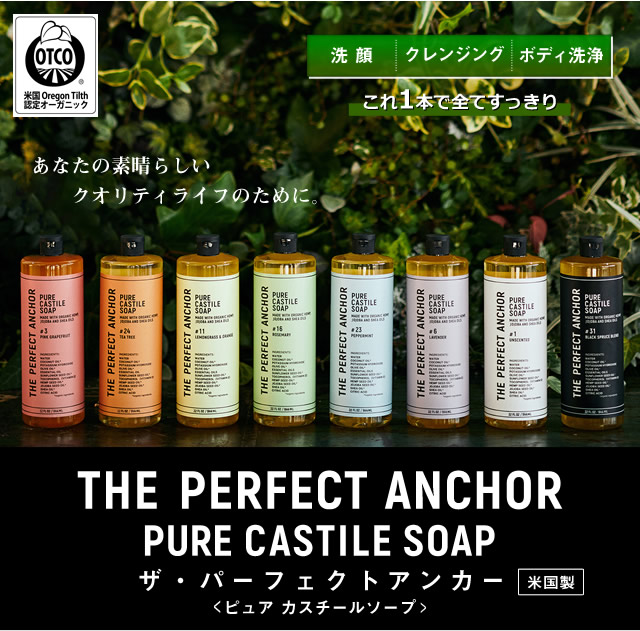 髪 クレンジング メイク落とし ボディ メイク落とし ザパーフェクトアンカー オーガニック石鹸 オーガニックせっけん オーガニック石けん オーガニックソープ ザ・パーフェクトアンカー 994ml 送料無料 認定オーガニック ボディーソープ 洗顔 メイク落とし 石けん シャンプー カスチール クレンジング シェービング ハンドソープ ボディ洗浄 アウトドア キャンプ 野外 食器洗い 歯磨き ペット用シャンプー 洗濯 パーフェクトアンカー