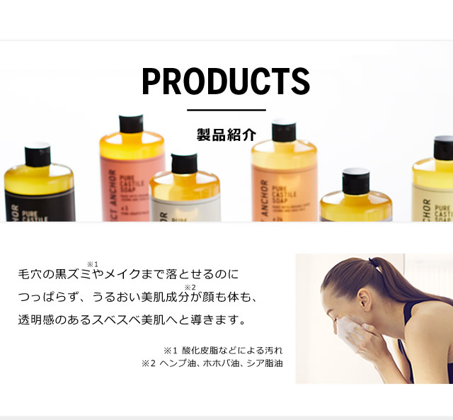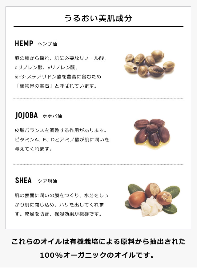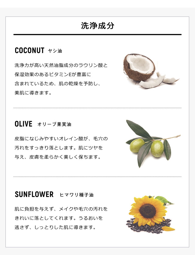 水、ヤシ油※、水酸化K、オリーブ果実油※、ヒマワリ種子油※、トコフェロール(ビタミンE)、アサ種子油※、ホホバ種子油※、シア脂油※、クエン酸 <アンセンティッド以外>