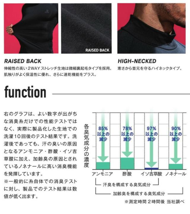 洗濯を繰り返しても高い消臭効果を発揮・持続し、伸縮性の高い2WAYストレッチの微細裏起毛タイプですので肌触りがよく、保温性にも優れています。