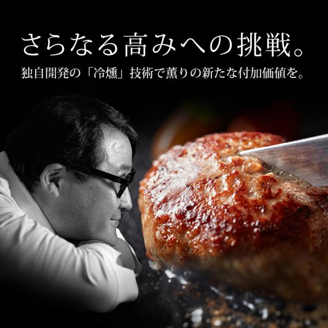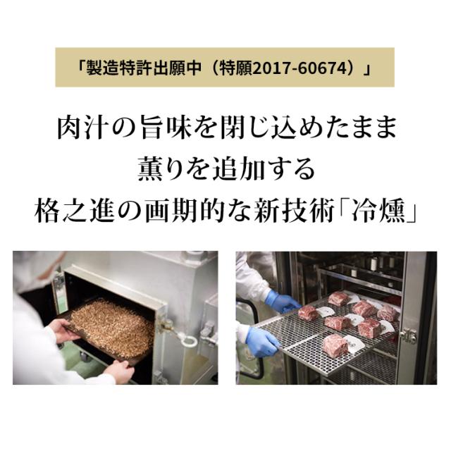 薫格ハンバーグの特徴格之進の大ヒット商品「金格ハンバーグ」を冷燻技術(特許出願中)でグレードアップ!その名も【薫格ハンバーグ】ハンバーグのために厳選された岩手県産を中心とした国産牛肉と、岩手県花巻市が誇る幻のブランド豚「白金豚」の合い挽きからなり、オール岩手県産の塩麹を使って肉の旨みを最大限引き出し、ソース無しでもお召し上がりいただける「金格ハンバーグ」。この「金格ハンバーグ」に冷凍のまま燻製するという新しい技術(冷燻)によって「薫り」という付加価値をプラスし、さらなる高みへとグレードアップしたハンバーグです。あふれ出る肉汁の薫りと鼻を抜ける燻製の香ばしさのマリアージュは、あなたを至福の時へと誘います。