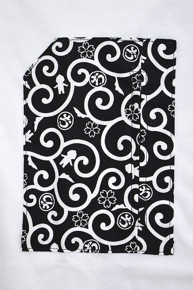 フロント右胸には、オリジナルのちぎり唐草柄生地で製作したファスナー付きポケットを縫い付けました。