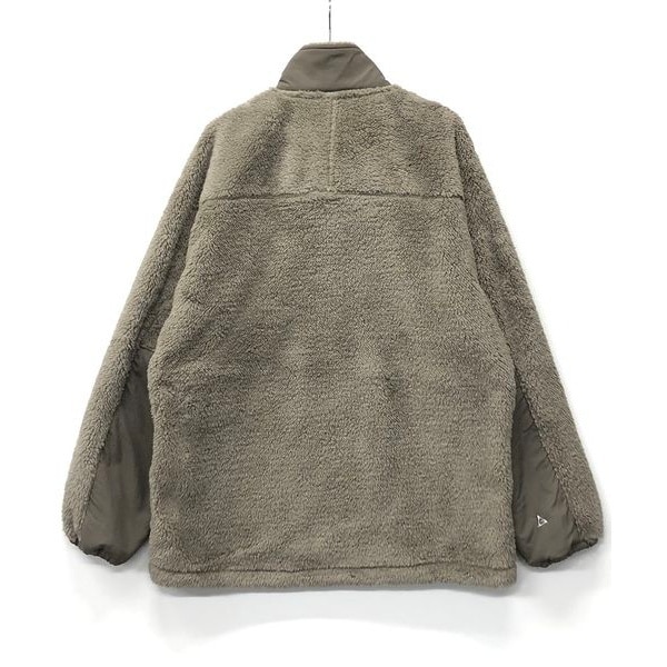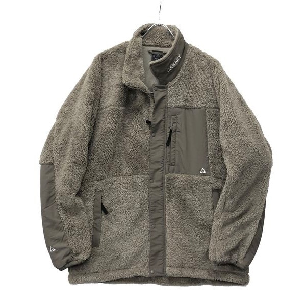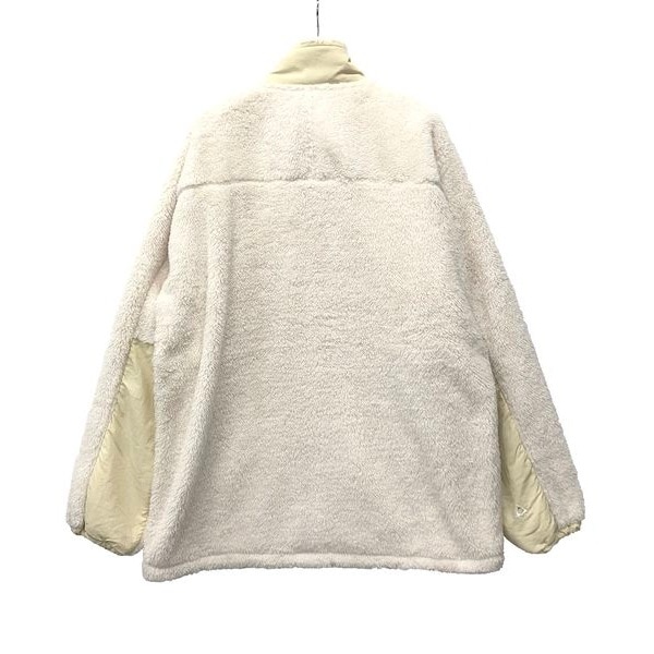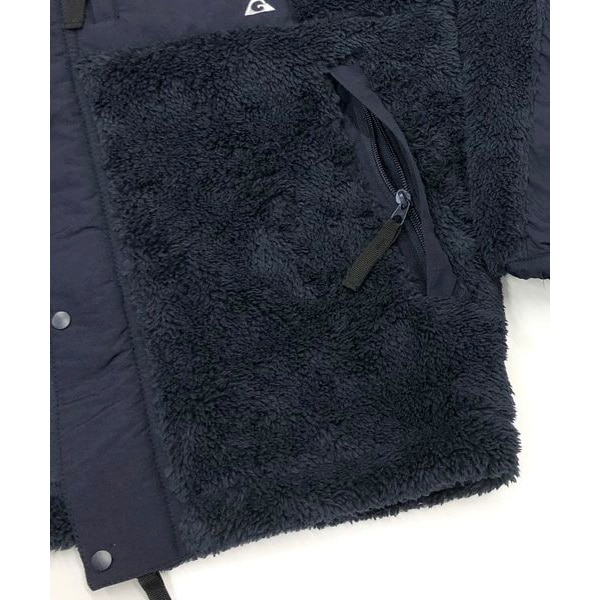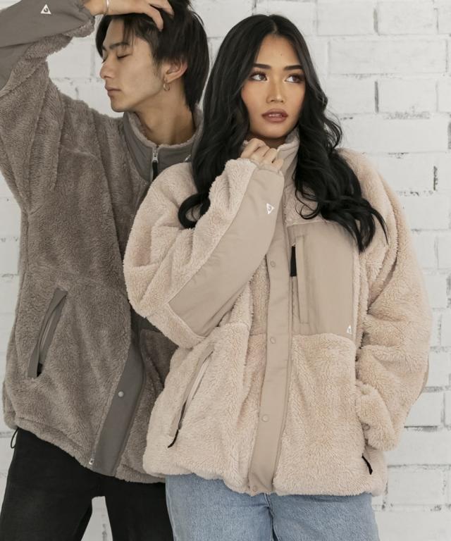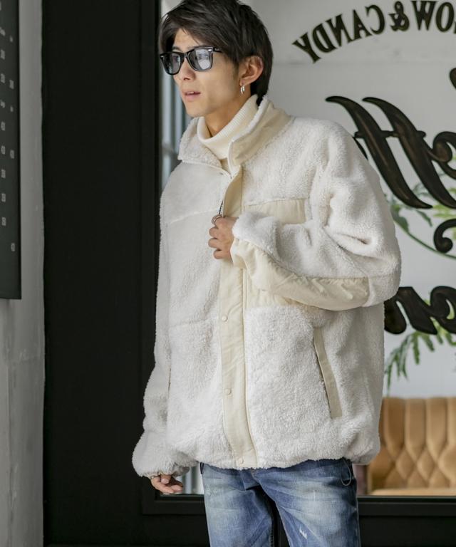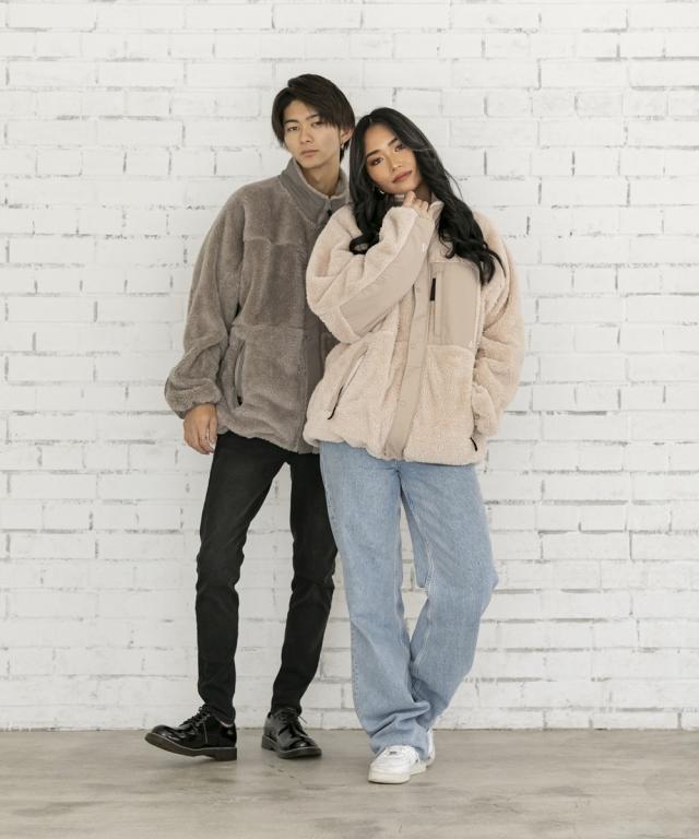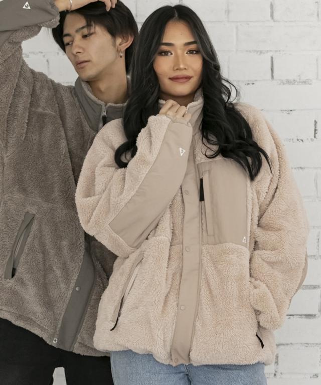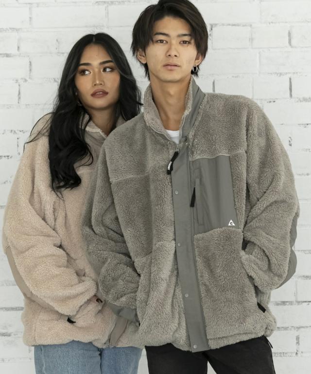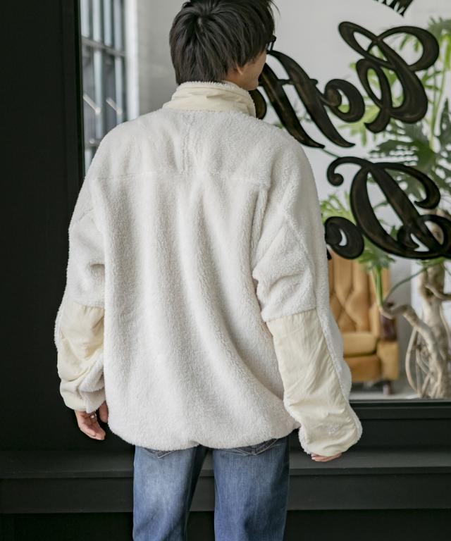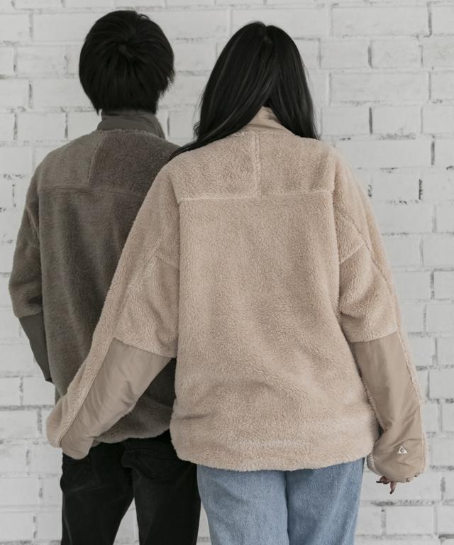 もこもこボア素材をベースに、軽くて丈夫なリップストップ生地の切り替えを施しています。