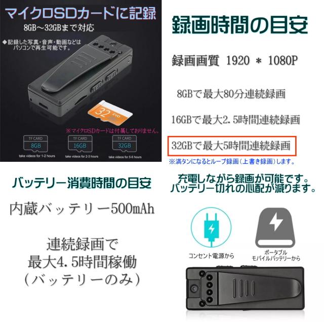 【マイクロSDカード】8GB〜32GBまで対応。録画時間は32GBで最大5時間連続録画!ループ録画機能あり。