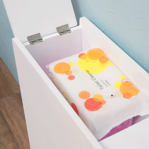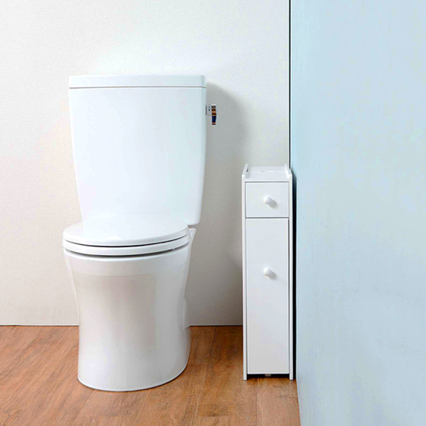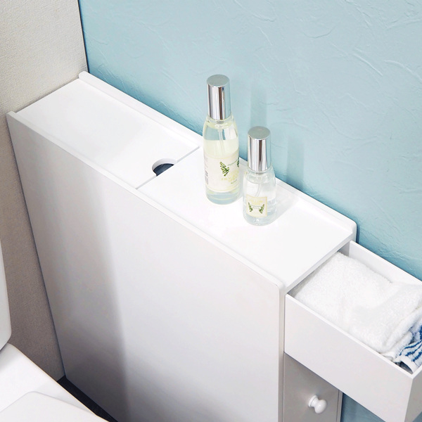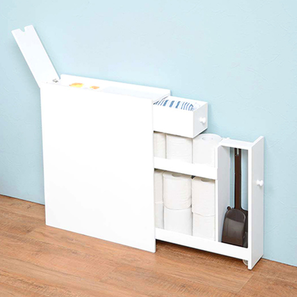 幅14cmのスリムさと清潔感溢れるホワイトカラーでトイレ内にすっきり収まるトイレラックです。スリムながらも収納する箇所がたくさんあるので使い勝手抜群です。トイレットペーパーはもちろん、トイレ用洗剤やタオルなど必要なもの全て、場所を取らずにまとめて収納できます。