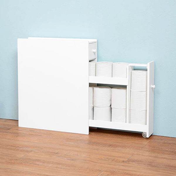 トイレットペーパーや、サニタリー用品、タオル、トイレブラシなどの必需品をまとめて省スペースで収納できます。また、たくさん収納して重くなっても、引き出しにキャスターが付いているのでスムーズに引き出すことができます。