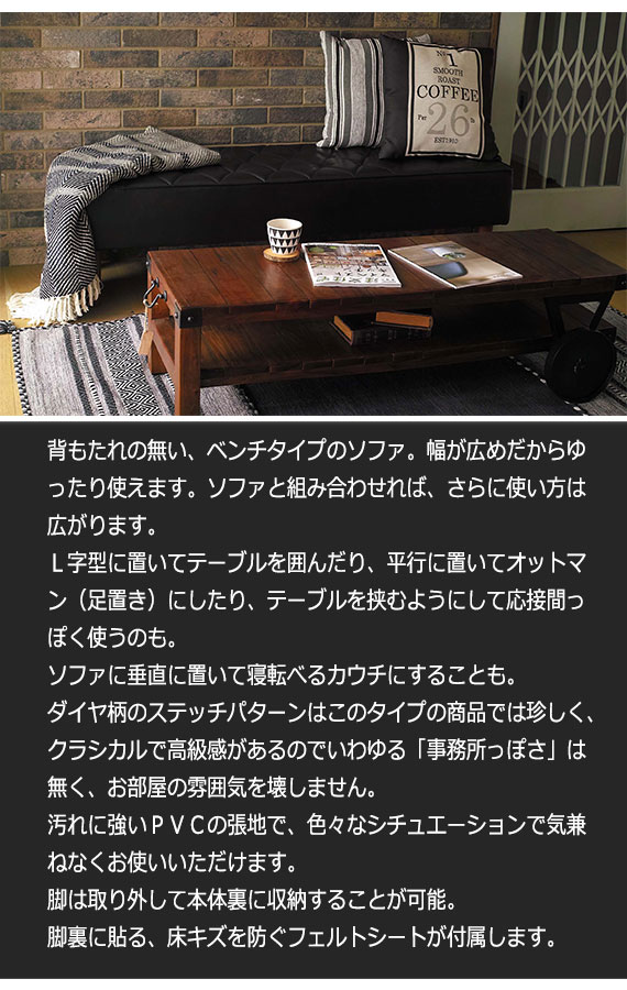 | 説明 | 背もたれの無い、ベンチタイプのソファ。幅が広めだからゆったり使えます。 ソファと組み合わせれば、さらに使い方は広がります。 L字型に置いてテーブルを囲んだり、平行に置いてオットマン(足置き)にしたり、テーブルを挟むようにして応接間っぽく使うのも。 ソファに垂直に置いて寝転べるカウチにすることも。 ダイヤ柄のステッチパターンはこのタイプの商品では珍しく、クラシカルで高級感があるのでいわゆる「事務所っぽさ」は無く、お部屋の雰囲気を壊しません。 汚れに強いPVCの張地で、色々なシチュエーションで気兼ねなくお使いいただけます。 脚は取り外して本体裏に収納することが可能。 脚裏に貼る、床キズを防ぐフェルトシートが付属します。 |