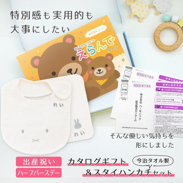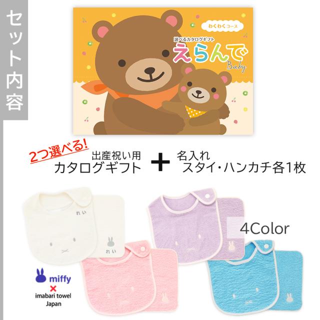 出産祝い カタログギフト えらんで Baby わくわくコースから2つ選べる& 今治タオル 名入れ ミッフィー スタイ・ハンカチ セット ギフトセット 男の子 女の子 ビブ 赤ちゃん ママ友達に贈りたい人気カタログギフト プレゼント よだれかけ 育児グッズ miffy ビブ