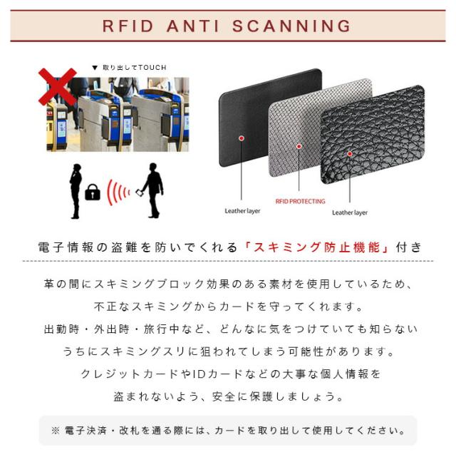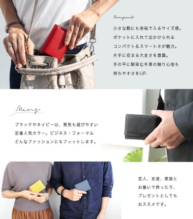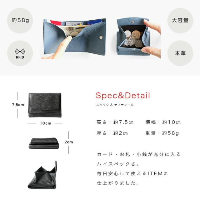 手の平サイズのシンプルなデザインに十分な収納を備え、かさばらないコンパクトさは小さめのバッグやポケットに入れて出かけるには丁度いいサイズ感になっています。マチ付きで大きく開く小銭入れは収納力はもちろん見易く出し入れもし易い構造になっています。素材として使用しているレザーは爪やコインでひっかいても傷がつかない優れた耐久性を持つ「安心感」のある素材になっており、磁気防止の特殊な生地を採用することでスキミング防止機能を備えていますので、普段使いにも安心してお使いいただけます。