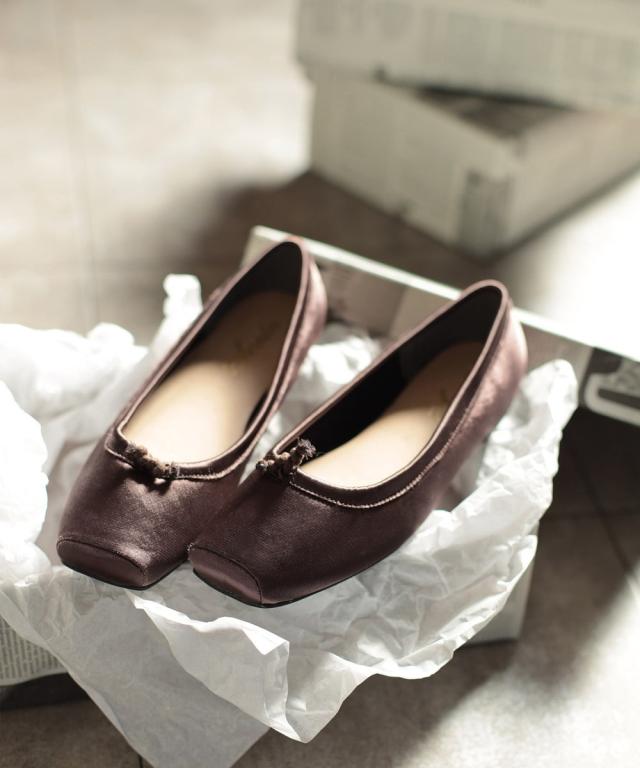 グロッシーサテンのスクエアトゥバレエシューズパンプス