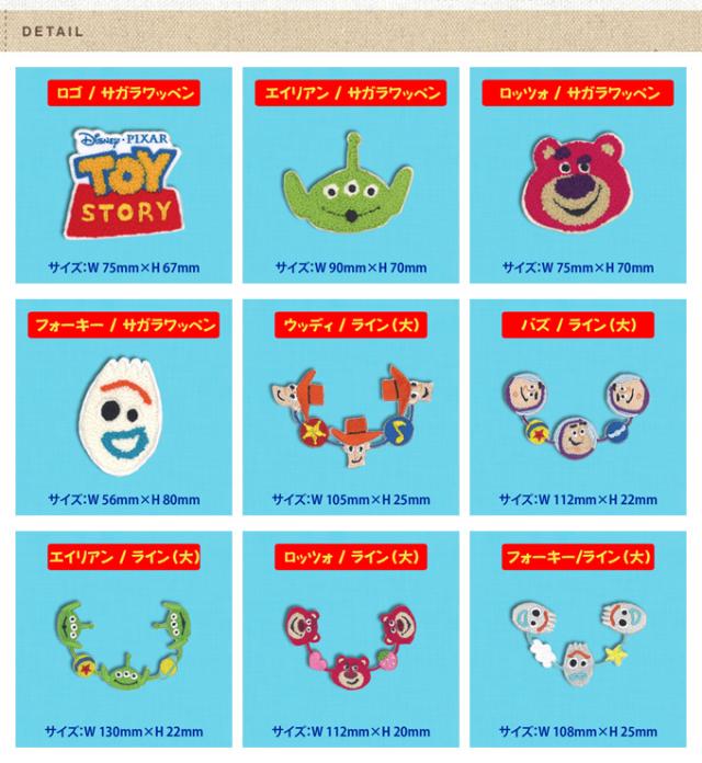 【ロゴ/サガラ】 約W 75mm×H 67mm 【エイリアン/サガラ】 約W 90mm×H 70mm 【ロッツォ/サガラ】 約W 75mm×H 70mm 【フォーキー/サガラ】 約W 56mm×H 80mm 【ウッディ/ライン(大)】 約W 105mm×H 25mm 【バズ/ライン(大)】 約W 112mm×H 22mm 【エイリアン/ライン(大)】 約W 130mm×H 22mm 【ロッツォ/ライン(大)】 約W 112mm×H 20mm 【フォーキー/ライン(大】 約W 108mm×H 25mm |