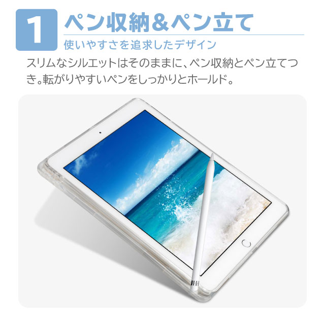 | 機能 | ・ケースを装着したまま電源ボタン操作・カメラ撮影・音量調節可 ・TPU素材で簡単着脱 ・ペンホルダー・ペン立て付属 ・操作を妨げない軽量仕様 |