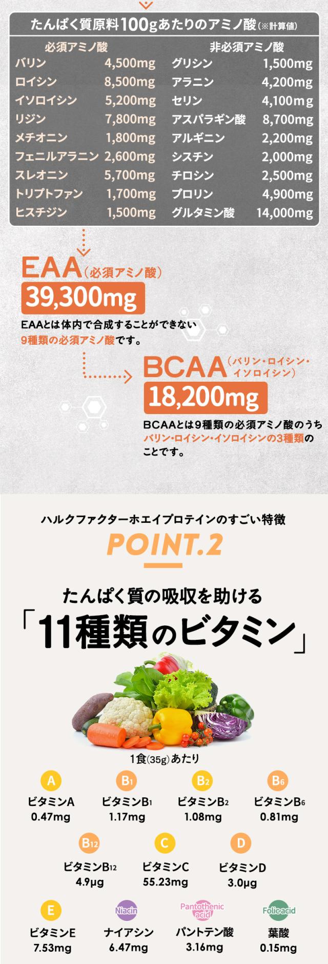 アミノ酸スコア100で100gあたり必須アミノ酸EAA 39,300mg(BCAA 18,200mg)。
