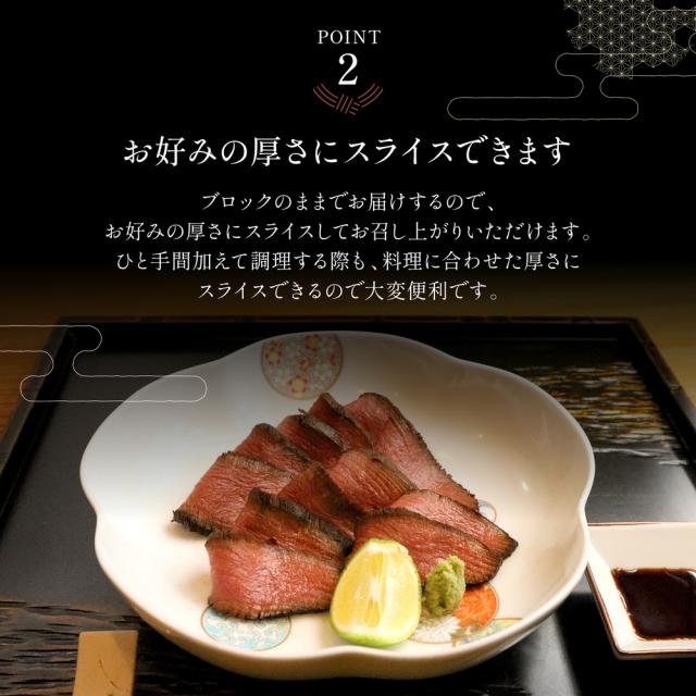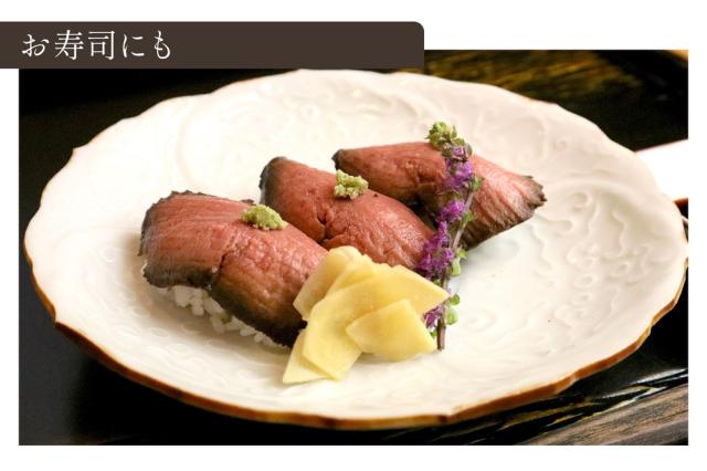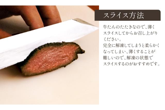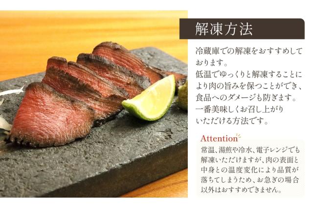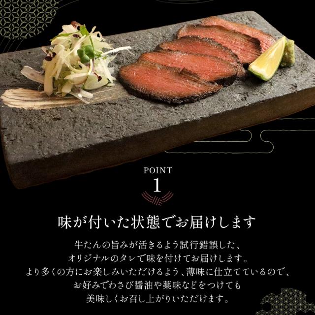 | 切るだけでいい本格牛たんローストビーフ 牛タン旨みを活かした絶妙な味付けだからソースが要らない ヘルシーなローストビーフ。 赤身の部分を使用しているから肉そのものの味わいと 牛タンならではの歯応えをご堪能ください。 より多くの方々にお楽しみいただけるよう薄味に仕立ててありますので、 お好みで市販のステーキソースやわさび醤油などでも 美味しく召し上がっていただけます。 |