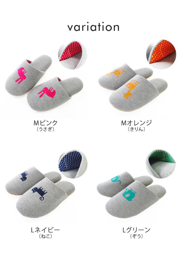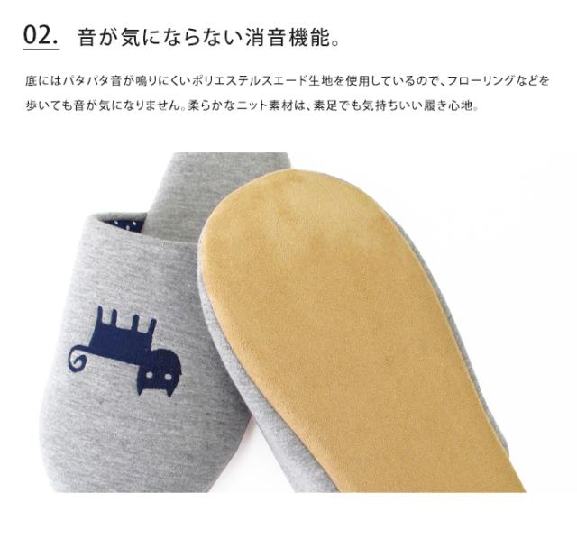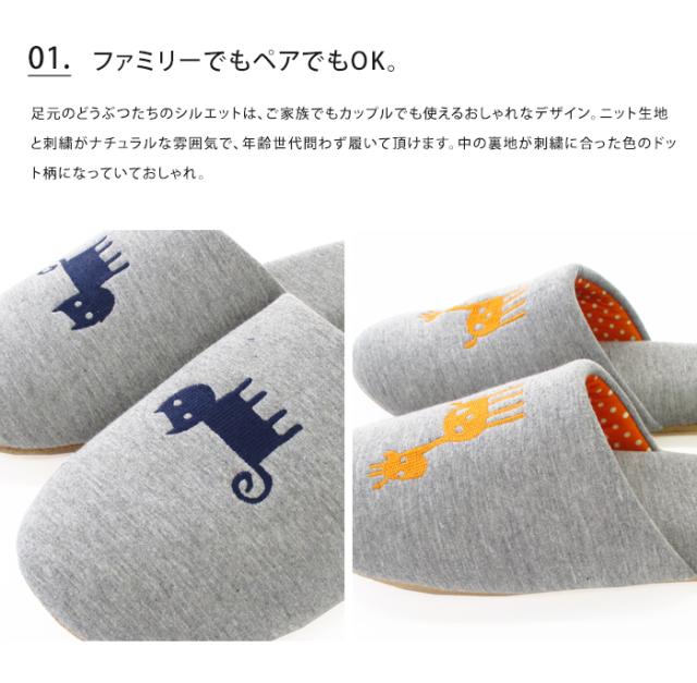 足元のどうぶつたちのシルエットは、ご家族でもカップルでも使えるおしゃれなデザイン。ニット生地と刺繍がナチュラルな雰囲気で、年齢世代問わず履いて頂けます。中の裏地が刺繍に合った色のドット柄になっていておしゃれ。底にはパタパタ音が鳴りにくいポリエステルスエード生地を使用しているので、フローリングなどを歩いても音が気になりません。柔らかなニット素材は、素足でも気持ちいい履き心地。