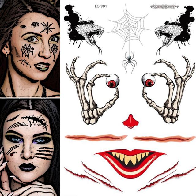 クモや蜘蛛の巣、ガイコツの手や目玉、スネークをや傷をモチーフにした仮装用ステッカー。