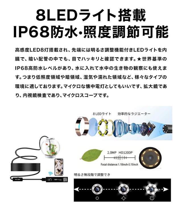 ・ 【8LEDライト搭載・IP68防水・照度調節可能】高感度LED8灯搭載され、先端には明るさ調整機能付きLEDライトを内臓で、暗い配管の中でも、目でハッキリと確認できます。★世界基準のIP68高防水レベルがあり、水に入れて水中の生き物の観察にも使えます。つまり低照度領域や暗領域、湿気や濡れた領域など、様々なタイプの環境に適しております。マイクロな懐中電灯としてもいいです、拡大鏡であり、内視鏡検査であり、マイクロスコープです。