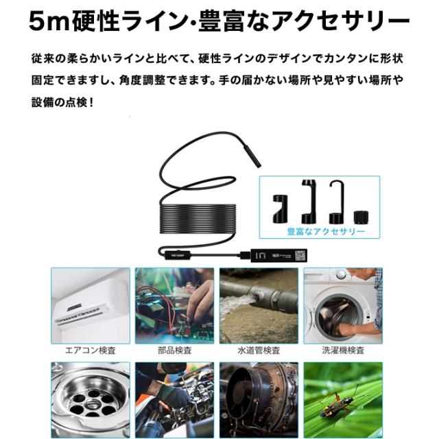 ・ 【5m硬性ライン・豊富なアクセサリー】従来の柔らかいラインと比べて、硬性ラインのデザインでカンタンに形状固定できますし、角度調整できます。手の届かない場所や見やすい場所や設備の点検!★豊富なアクセサリーが付きますので、様々なシーで使えます。日常用途:通気管、洗濯機、冷蔵庫の下、本棚の裏、ソファの下などの検査します。研究用途 :生物植物の観察・教育現場など場所に使用します。 工業用途:排水溝、天丼裏、 エンジン、自動車、船舶、航空機などの検査します。