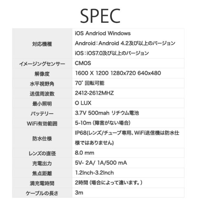 ・ 【HD1200P・超高画質】高性能フレキシブルな8.0mmレンズ、1200Pのワイヤレス内視鏡カメラが登場!720Pより2倍鮮明がある1200Pで目標物を細かいところまで超鮮明に見ることができ、静止のものや運動のものがはっきり撮影されることができます。★1600*1200、1280*720、640*480などPixels三種類の解像度を提供できます、映像の記録することができ、動画の撮影も可能です。 ・ 【WiFi接続・外部電源不要】ワイヤレス設計、WiFiで簡単にデバイスに接続できます。スマホ iphone android ios など機種対応します。★電池内蔵し、エンドスコープを使用する際には、外部電源及び外部電源ケーブルが必要ないので便利です。