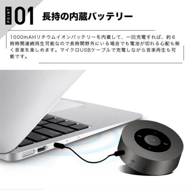 1000mAHリチウムイオンバッテリーを内蔵して、一回充電すれば、約6時時間連続再生可能なので長時間野外にいる場合でも電池が切れる心配も無く音楽を楽しめます。マイクロUSBケーブルで充電しながら音楽再生も可能です。