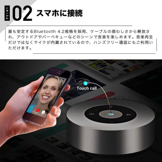 最も安定するBluetooth 4.2規格を採用、ケーブルの煩わしさから解放され、アウトドアやバーベキューなどのシーンで音楽を楽しめます。音楽再生だけではなくマイクが内蔵されているので、ハンズフリー通話にもご利用いただけます。