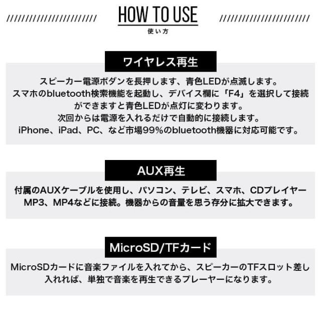 スピーカー電源ボダンを長押します、青色LEDが点滅します。スマホのbluetooth検索機能を起動し、デバイス欄に「F4」を選択して接続ができますと青色LEDが点灯に変わりmさ宇。次回からは電源を入れるだけで自動的に接続します。iPhone、iPad、PC、など市場99%のbluetooth機器に対応可能です。