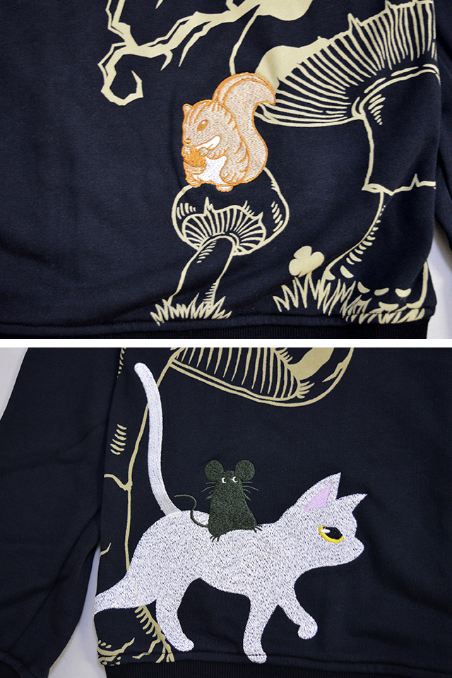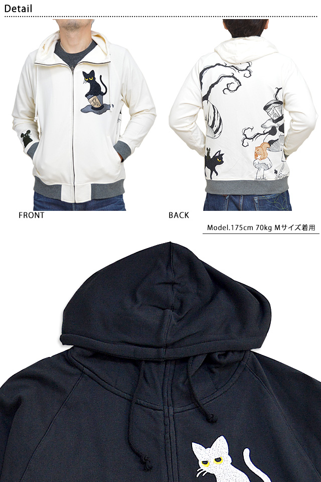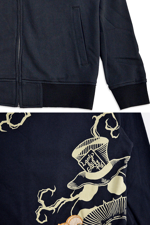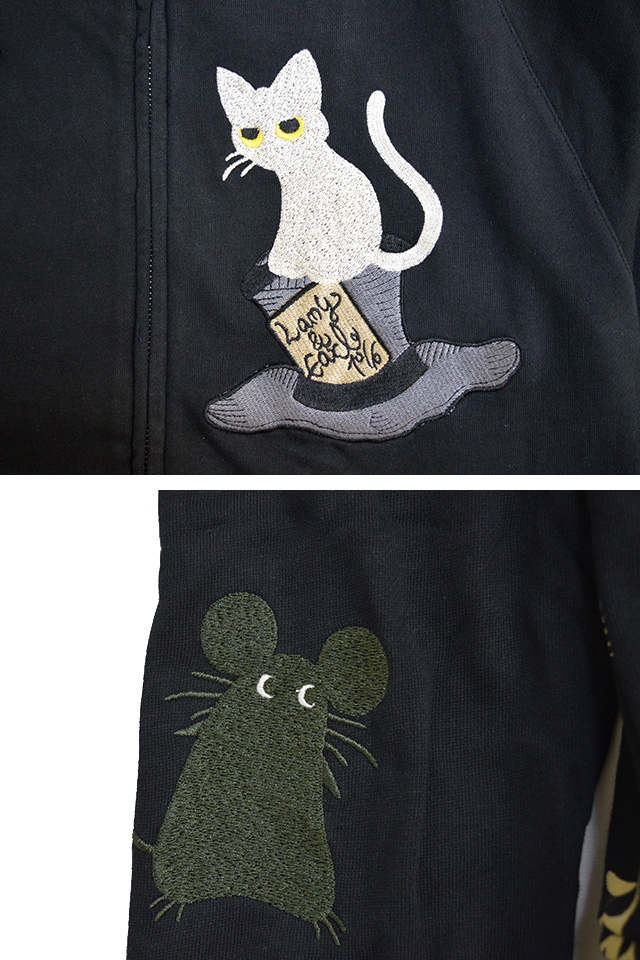 何でもあり、何でもやる新ブランド「LIN」から、「不思議の国のラミアールジップパーカー(ALLP-75010)」のご紹介です。 黒猫のLamy(ラミ)とネズミのEarl(アール)。 フロント左胸には、ロゴ入りのシルクハットに乗っかったラミの姿をワンポイントで刺繍。 ボディーには、ややしっかりとした裏毛タイプのスウェットを採用。 | ||||||||||||||||||||