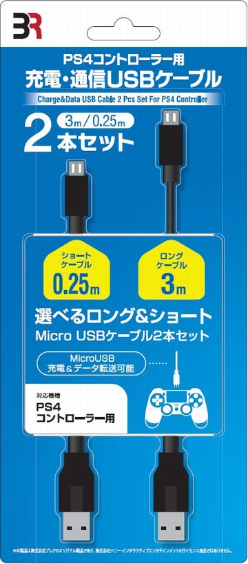 商品名:PT PS4コントローラー用 充電・通信ケーブル (ショート0.25mとロング3mのMicro USB 2本セット) BR-0009 ブレア