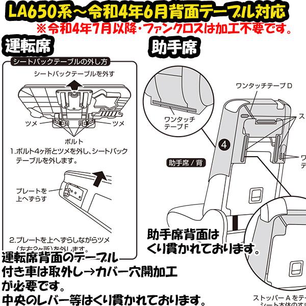 ※※運転席背もたれ背面テーブル付き車は、ボルト4か所とツメを外しテーブルを一旦取り外して頂き、 カバー装着後、ボルト、ツメの位置に切れ込みを入れて再度テーブルを付ける手順となっております。 中央のレバー及びスイッチ部分は元々カバーがくり貫かれております。 助手席背面はプラスティックの台座がある為、元々大きくカバーがくり貫かれております。