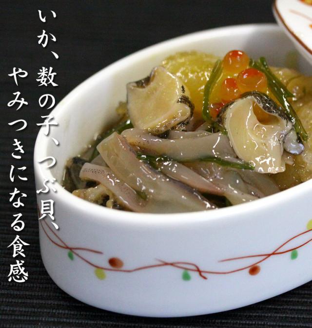 いか、数の子、毛つぶ、いくら、昆布を特製の醤油ダレで漬け込んだ「海の宝石箱」のような松前漬け。
