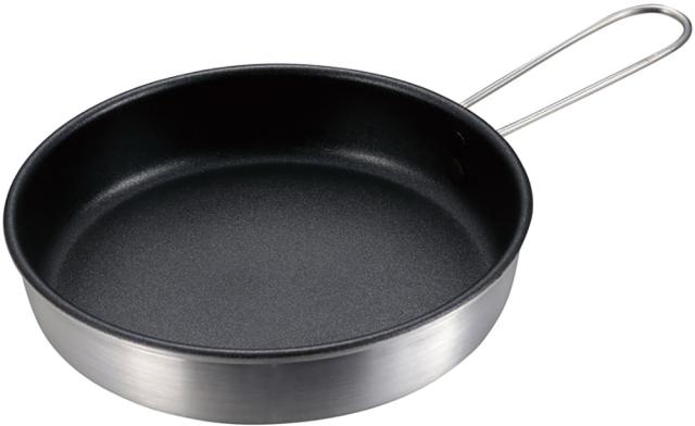ハンドルが折りたたみ式でコンパクトに収納できるミニフライパンです。素材は軽くて扱いやすいアルミ製。お手入れ簡単なこびりつきにくいふっ素樹脂加工。小型ガスバーナーコンロにも使える携帯に便利なミニフライパンです。
