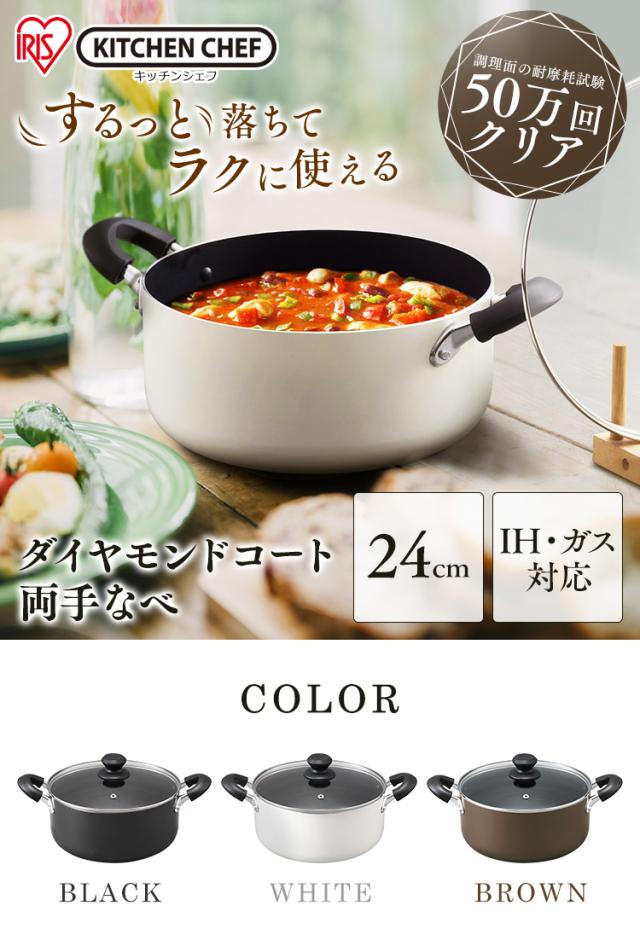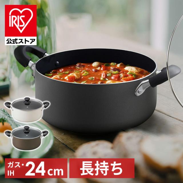 両手鍋 24cm IH ガス火 アイリスオーヤマ 高耐久4層構造 ダイヤモンドコート 丈夫 長持ち こびりつきにくい するっと落ちる お手入れ簡単 シンプル おしゃれ インテリア ガラスふた付 4.7L 一人暮らし ひとり暮らし 鍋 なべ 単品 DIS-P24 *