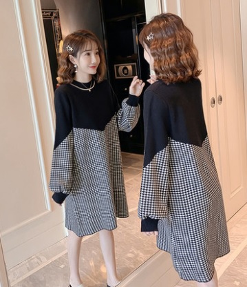 ワンピース Aライン 大きいサイズ ゆったり ひざ丈 長袖 秋 お出かけ パーティー 二次会 黒 バイカラー 千鳥格子柄 ラウンドネック 大人可愛い 上品 お呼ばれ デート 女子会 キュート トレンド 10代 20代 30代