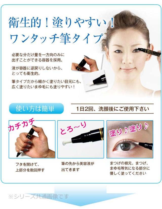 | ご使用方法 | 容器の後部部分を押し筆先に美容液が浸透させ、適量を塗布してください。1日2回程度、洗顔後にお使いください。メイクをする場合はしっかり乾いてから行ってください。 |