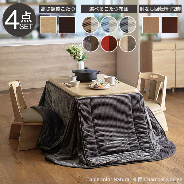 【パワフルヒーター/高さ調節機能付き/4点セット】こたつセット ダイニングこたつ アコード 105x80cm +専用省スペース布団 +回転椅子2脚 12色対応 ハイタイプ 本体 石英管 継ぎ脚 長方形 イス チェアー I-2700130