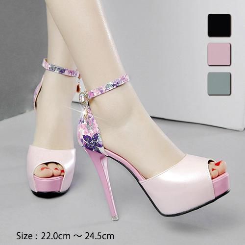 【グラシア】 キャバ ヒール 靴 シューズ ハイヒール12cm サンダル 安定感 PU ラバー ガーリー ストラップ バイカラー 花柄 愛らしい ピンク ブルー ブラック