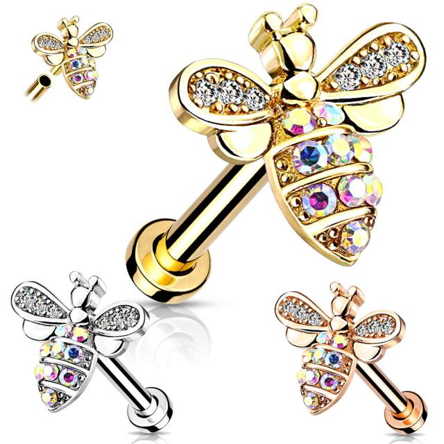 サージカルステンレス316L製の逆ネジ(内ネジ)タイプのラブレットスタッドにクリスタルや虹色レインボーのジルコニアを散りばめたパヴェタイプの蜜蜂ビーをデザインした16ゲージのボディピアス。