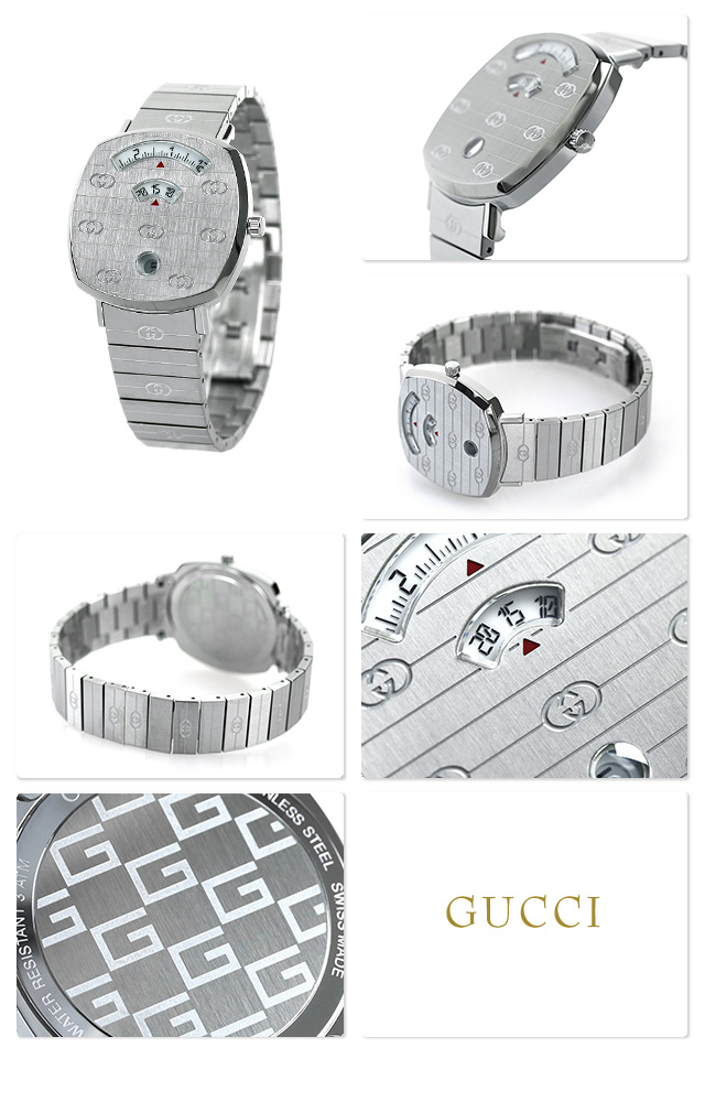 7年保証キャンペーン グッチ グリップ 35mm スイス製 クオーツ ペアウォッチ ユニセックス メンズ レディース 腕時計 YA157401 GUCCI GRIP アナログ シルバー ◆1921年、グッチオ・グッチは革製品の会社を起業し、フィレンツェに小さな鞄店を開業。ブランドに対する彼のビジョンは、ロンドンと、彼がサボイ・ホテルで働いていた時に見た英国貴族の洗練された審美眼から培われたものです。財布や革製品以外にもアクセサリーや腕時計も品質の高さや、洗練されたデザインが人気で一気に高級ブランドの地位を確立しました。今では名を知らない人はいないぐらい世界的に有名なブランドです。 1970年代後半のスケートボーダーにインスピレーションを得たグリップ。ヴィンテージウォッチのような印象ながら、ミニマルで洗練されたスタイルを醸し出します。3つの窓から見えるホワイトディスクに時間、分、日付を表示。誕生日や記念日などのプレゼントにはもちろん、ペアウォッチとしてもおすすめです。