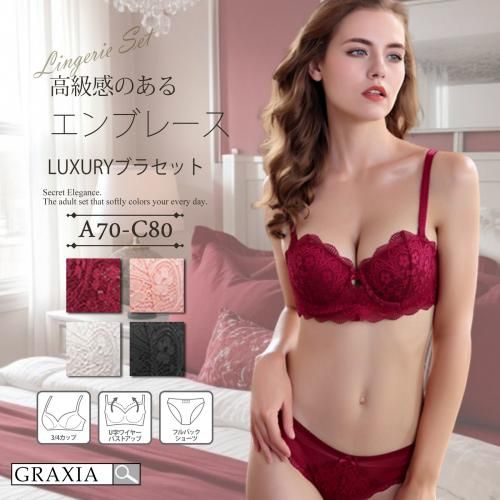 【グラシア】 ブラジャー ショーツ セット ブラセット ランジェリー 下着 カップ スカラップレース パッド ふんわり エンブレース マシュマロフィール エアリーパッド 可愛い 高級感 華やか 柔らか 大人 レース ブラック ホワイト ライトピンク ワインレッド