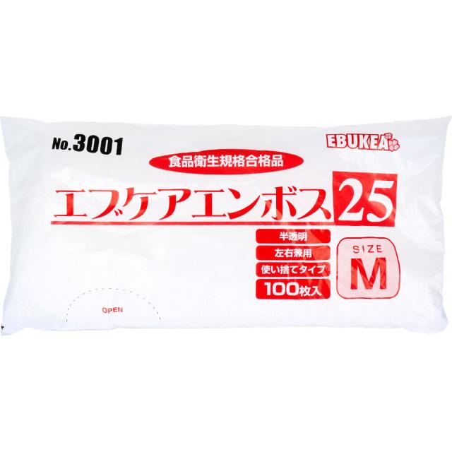 No.3001 エブケアエンボス25 食品衛生法適合 使い捨て手袋半透明 Mサイズ 袋入 100枚入