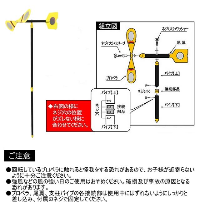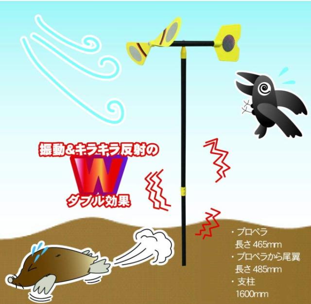 | 特徴 | 風の力でプロペラが回りホログラムが光って鳥よけに。 支柱に振動が伝わって、地中のモグラを追い払うダブル効果! 微風でもプロペラが回り、回転力アップ。電源不要、自然に優しい。 組立てタイプです。 |