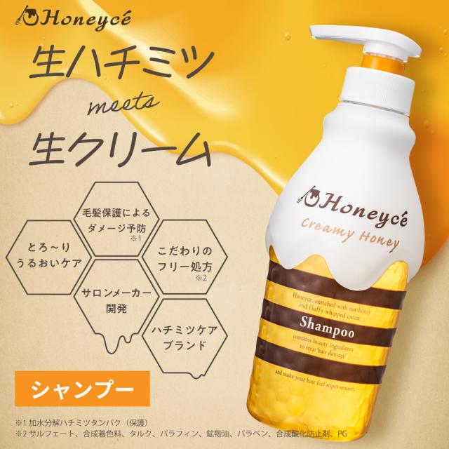 | 特 徴 | 生ハチミツ※1と生クリーム成分※2が髪を包み込み、ふわもこ濃蜜泡でやさしく洗い上げるノンシリコンシャンプー。ハチミツ由来のダメージケア&予防成分が傷んだキューティクルに高蜜着して徹底補修するとともに新たな髪ダメージを予防します。