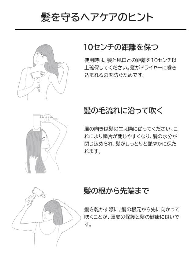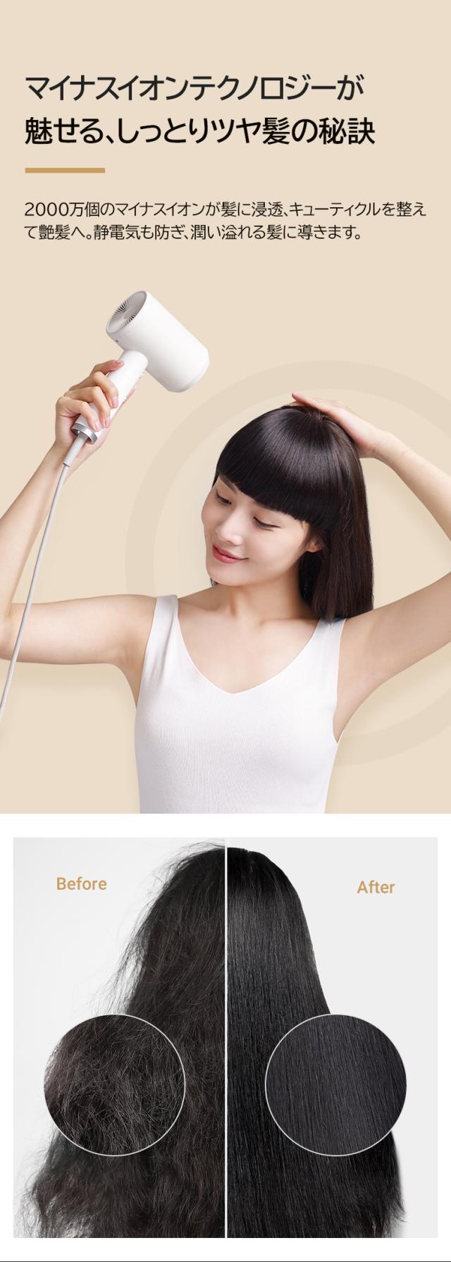 ・マイナスイオンテクノロジーが静電気を防ぎ、キューティクルを整えて髪に健康的なツヤを与えます。