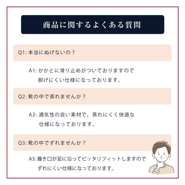 - 商品が届きました。迅速なご対応本当にありがとうございました。早速開封しましたが、とてもおしゃれな靴下ですね。何より脱げにくいのがありがたいです。ありがとうございました方