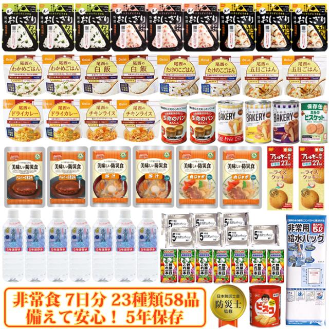 非常食 送料無料 防災セット 水 非常食 58点セット 7日分 ごはん おにぎり 5年保存 防災グッズ キャンプ アウトドア 保存食 ウェットティッシュ 給水バッグ 詰め替え用 備蓄用 災害対策 地震対策 防災用品 避難グッズ 家族 避難用品 わかめごはん 【7-10日】