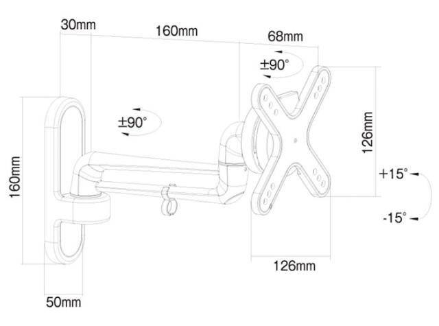 ■仕様:前傾 15°/後傾 15、左右首振り ±90°、ディスプレイ回転 360°、VESA取付穴(幅/高)75〜100mm