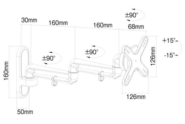 ■仕様:前傾 15°/後傾 15°、左右首振り ±90°、ディスプレイ回転 360°、VESA取付穴(幅/高)75〜100mm