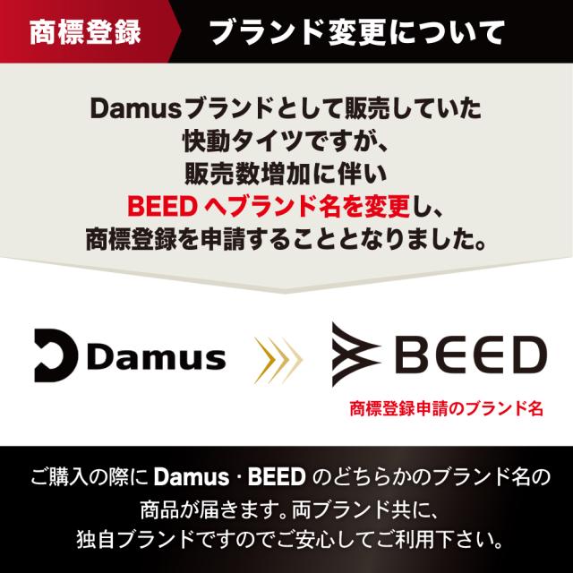 “筋トレの際に使用しているのですが、履いた時にピタッと脚を圧着する感じがすごく気に入りました。”、“スタイリッシュで機能性抜群!こんないいものがあれば早く購入しておけば良かった。”、“配送も早く品質も良かったです。コスパは良いです。また、注文するでしょう!!適度のコンプレッションで締め付け感もあります。汗も直ぐに乾きます!!”などの高評価を頂き、他サイトのレビュー平均点も4.0点以上を頂いております。誠に嬉しい限りで御座います。ありがとうございます!今後も現状に満足することなく商品改良を行い、最新モデルとしてより良い商品提供を出来る様に精進致します。ブランドロゴについて商標登録取得の為にDamusもしくはBEEDで商品をお届けさせて頂いております。ブランド名は異なりますが同一の商品となりますのでご了承の程お願い致します。