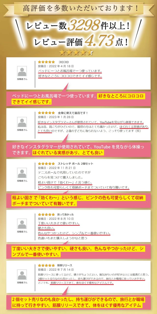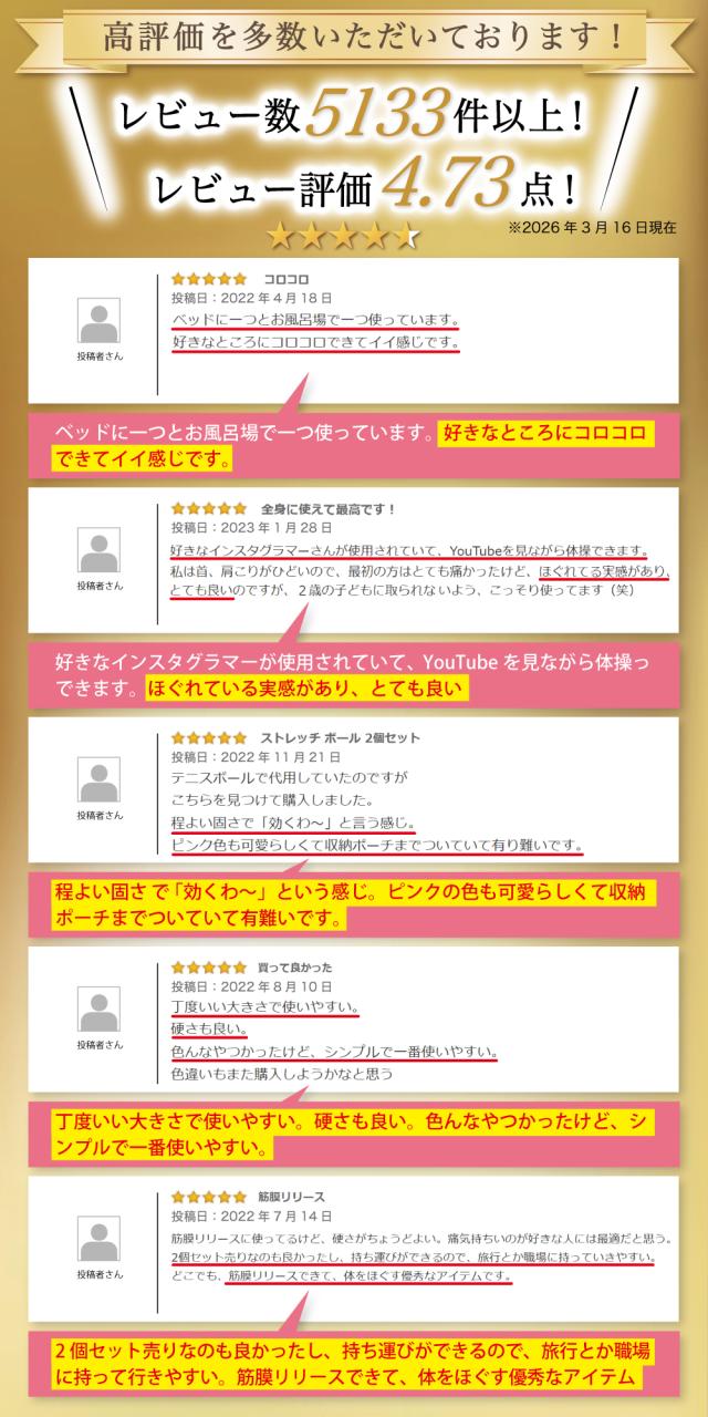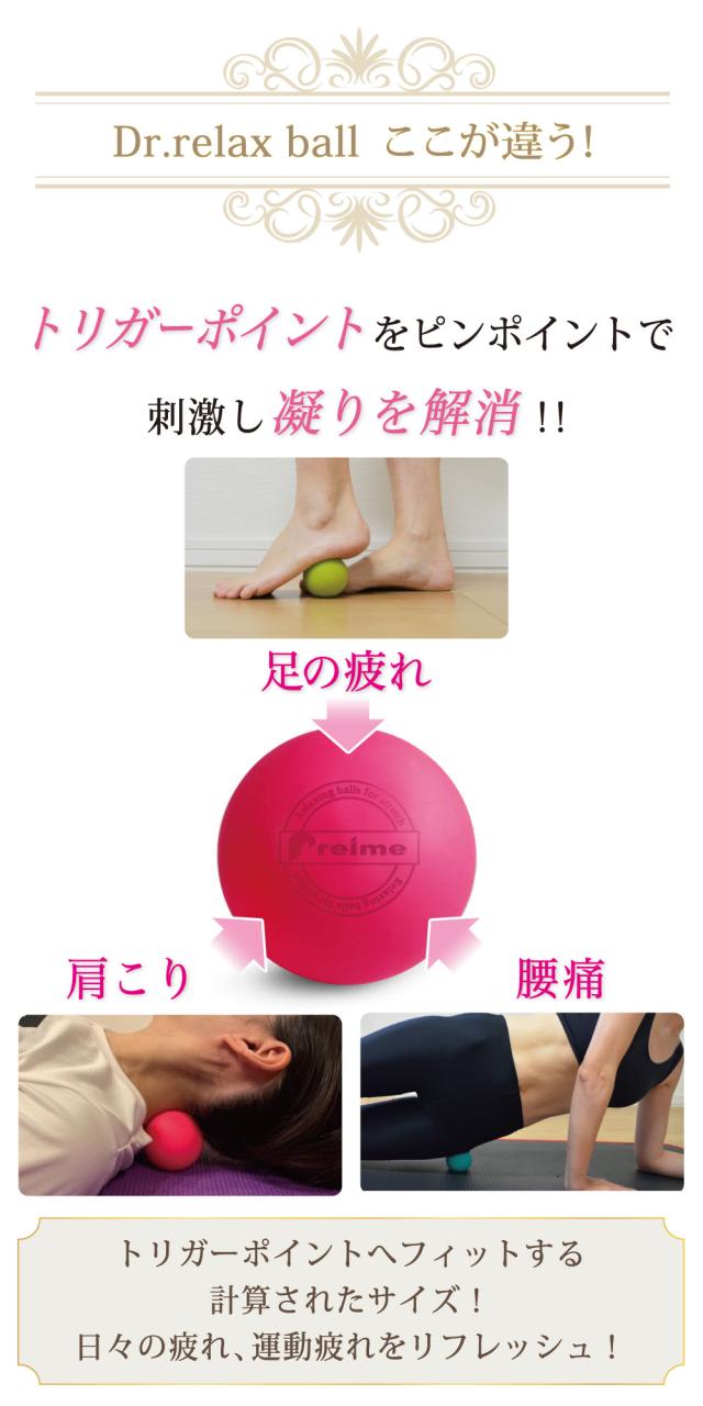 | 2 | 『トリガーポイントを刺激する大きさ』 スポーツ工学に基づきトリガーポイントを刺激する大きさにしております。 その為全身での利用が可能です。 |